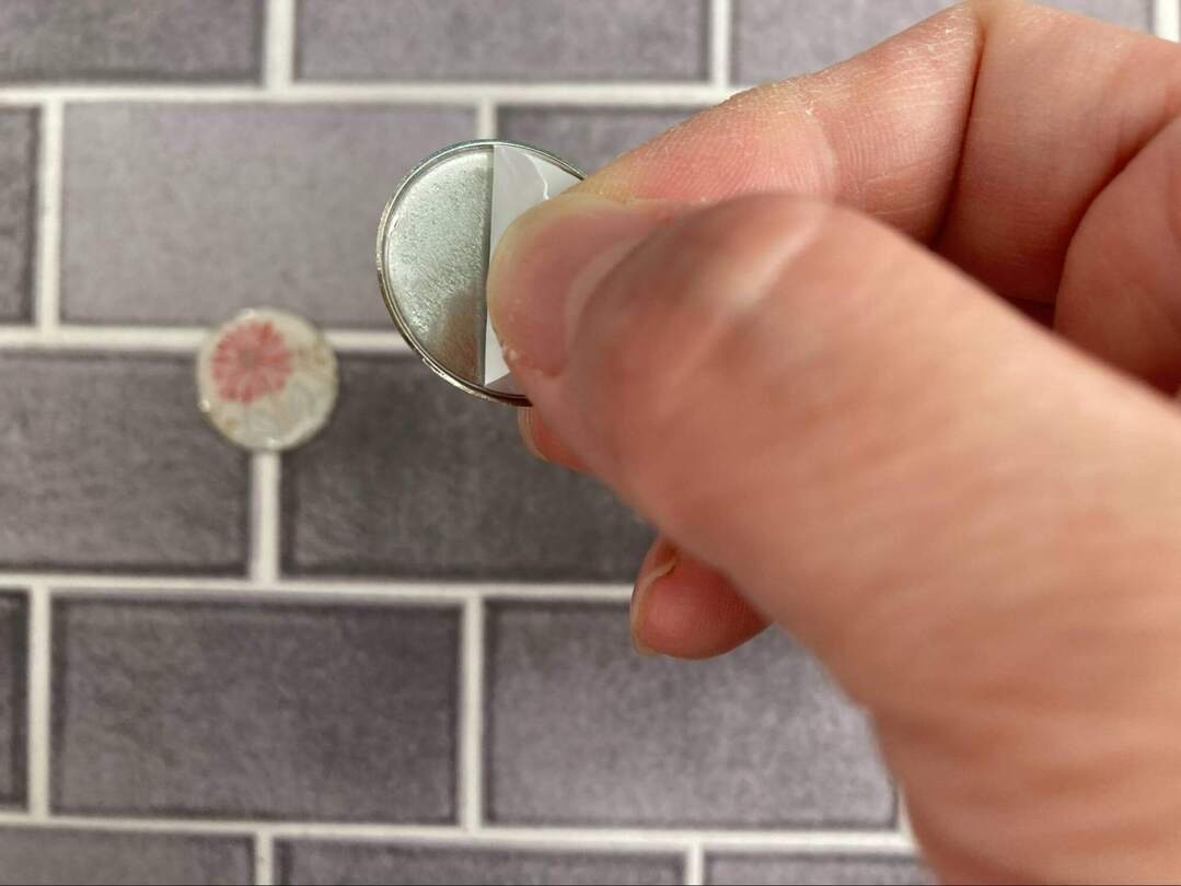 使うデザインが決まったら、透明のカバーのシールをはがしてバッジにしたい部分に貼りつけます。