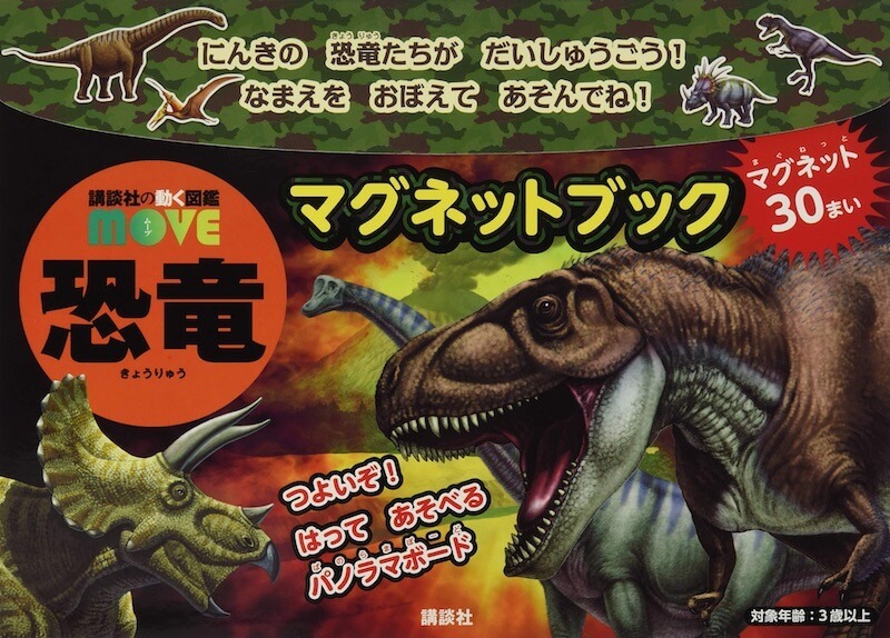 ティラノサウルスやブラキオサウルスなど、子どもに人気の恐竜25種類を厳選した講談社『MOVE』シリーズのマグネットブック。