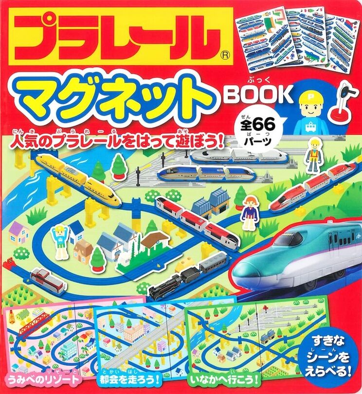 全66パーツ、プラレールの人気車種がたっぷりと入った、子どものテンションが上がるマグネットブックです。