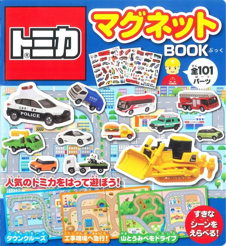 乗用車からはたらく車、看板や工事用品まで、101パーツのマグネットがついたトミカのマグネットブック。