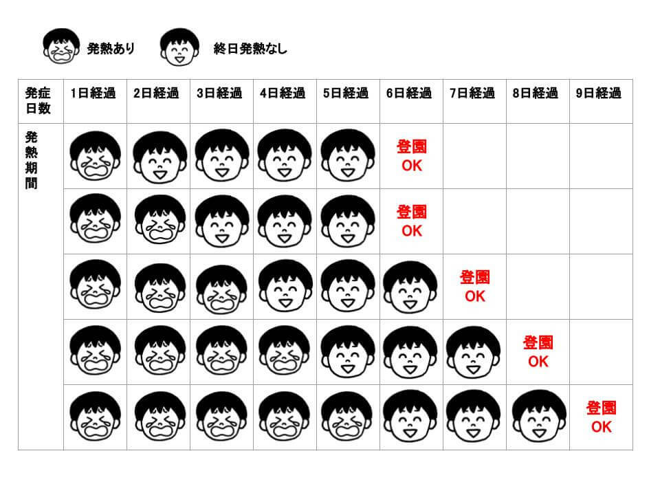 インフルエンザは、学校安全保健法には「発症したあと 5 日を経過し、かつ、解熱した後 2 日(幼児にあっては 3 日)を経過するまで」と書かれています。なお、発熱した日は「0日目」、一日中平熱に戻った日が「解熱した日」となります。幼児の場合には、上記の表を参考にしてください。