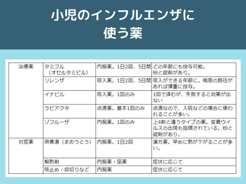 インフルエンザと診断された場合、上記にあるような治療薬・対症薬が処方されることが多いでしょう。吸入薬は手軽ですが深呼吸ができないと難しく、小学生以上ぐらいにならないと効果が出にくいです。