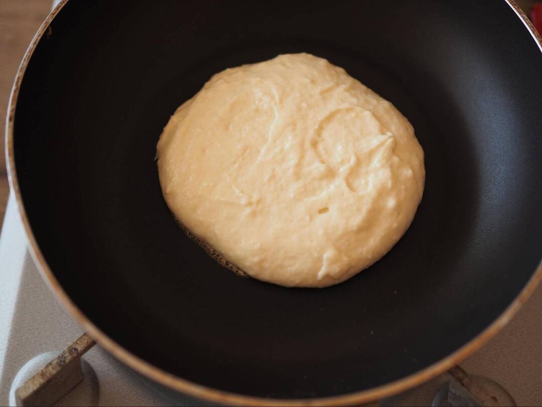 3.フライパンを極弱火で熱し、2をお玉ですくって流し、しっかり焼き色がつくまでじっくり焼きます。