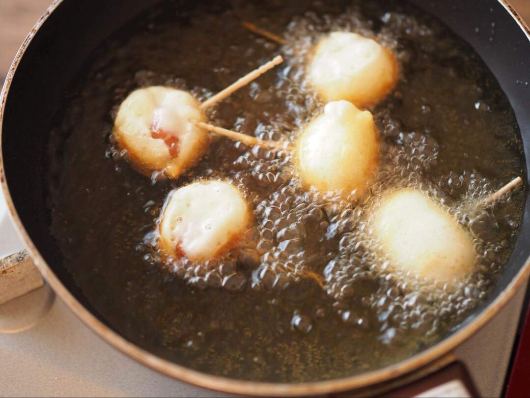 衣をつけて揚げるのに便利なので爪楊枝を使いますが、揚げ終わったら外してからどうぞ。