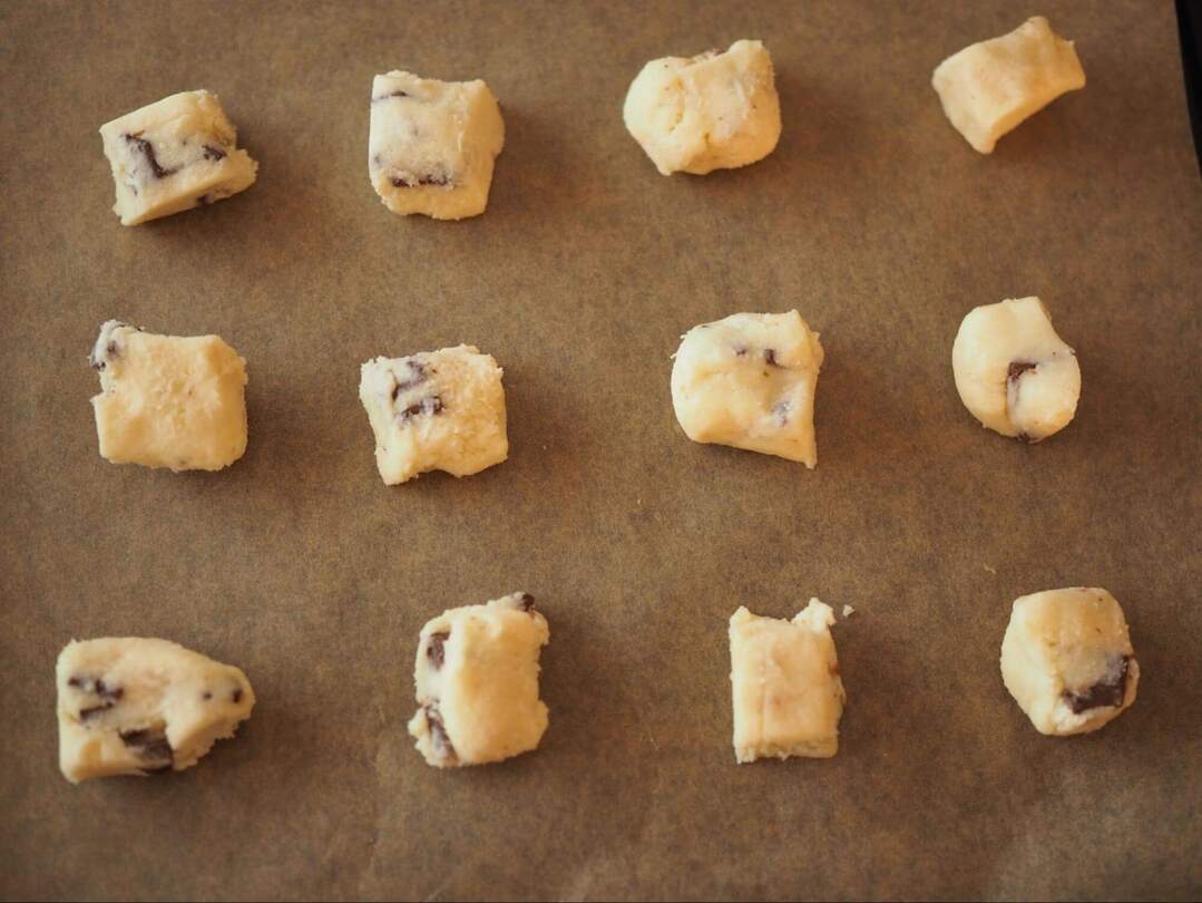 3.オーブンを180℃に予熱します。生地を包丁で12個に四角く切り分け、オーブンシートを敷いた天板に並べます。多少不揃いでも形が悪くてもOK。