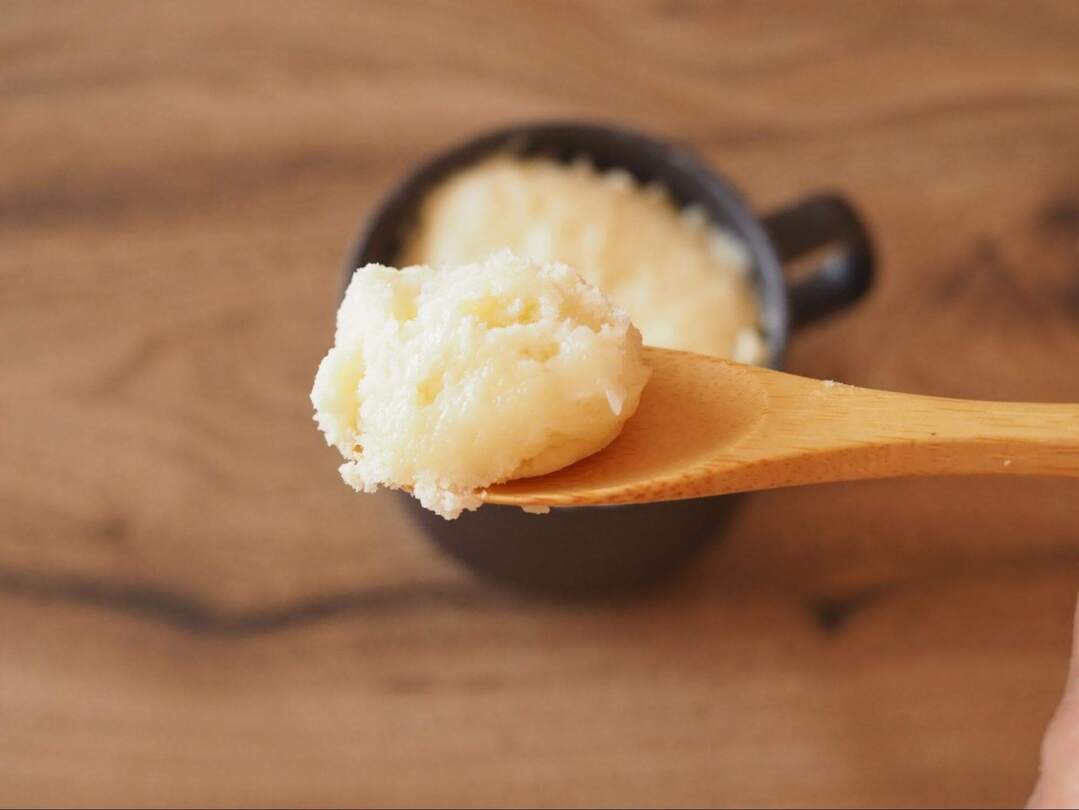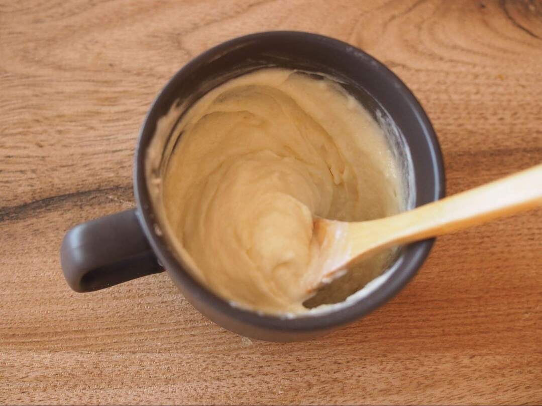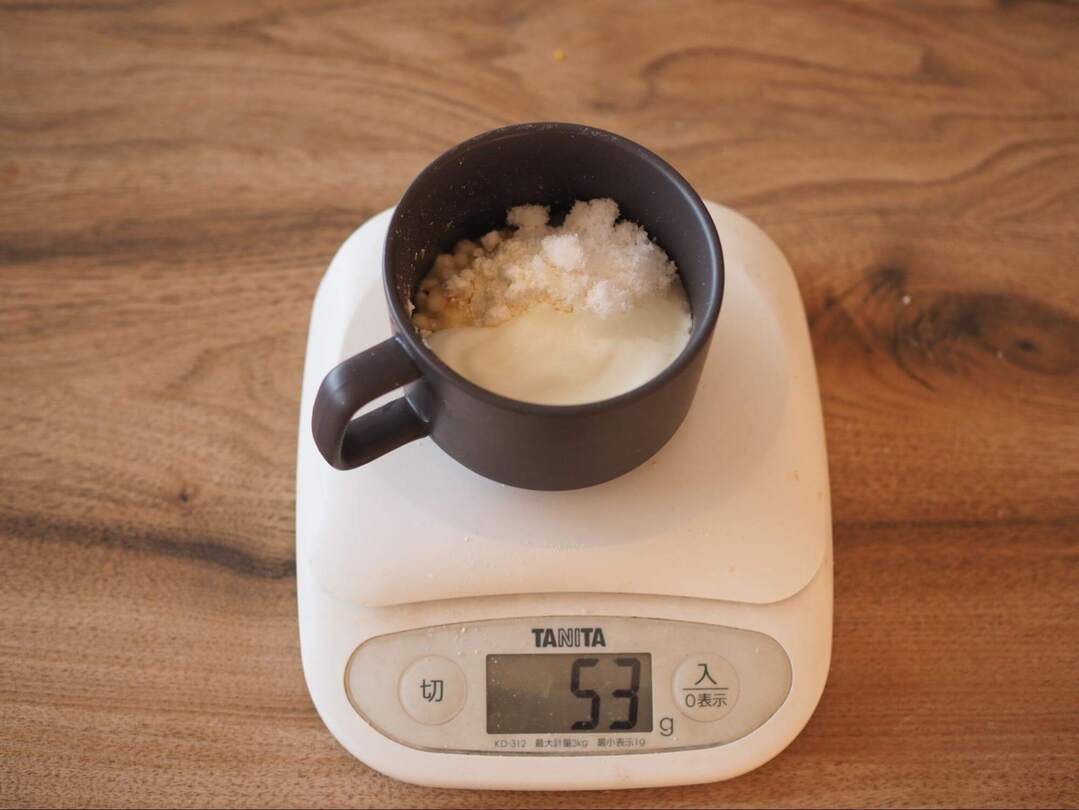 1.耐熱のマグカップに材料をすべて入れます。計りの上で計量しながら合わせると洗い物も増えず便利です!