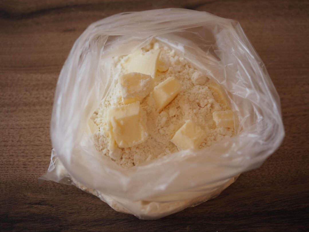 1.ポリ袋にホットケーキミックス、小さめに切ったバター、水を入れて袋の上から手でもみます。