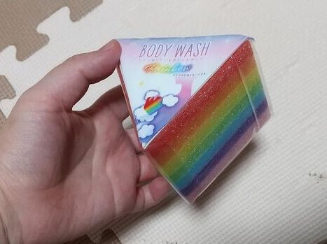 虹色が好きなので迷わず買ったこちらの商品。ピースケーキの形で、スポンジが7色の層にわかれています。