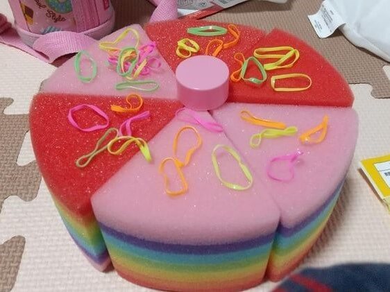 娘さんが自分で考えたトッピングはペットボトルのキャップと、カラフルなヘアゴム!レインボーケーキがさらに華やかになりました。