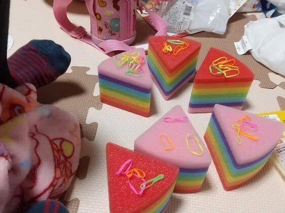 何より、フェルトやスクイーズのおもちゃと違うのは「ケーキとして作られた物ではない」ということで、子どもが工夫して遊べます。