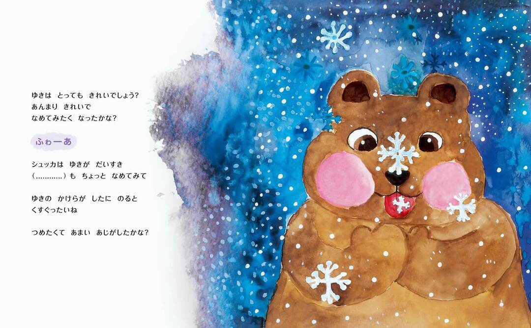 お話の舞台は雪に包まれた森の中。くまのシュッカといっしょに"ゆめのたび"に出かけます。