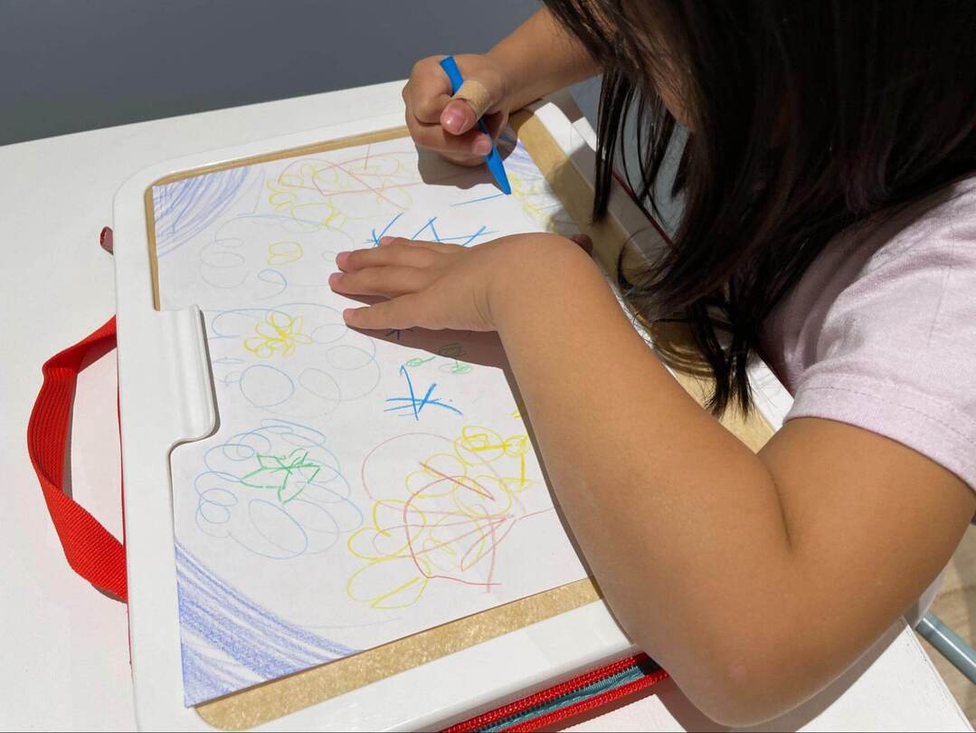 ケースの裏面はお絵かきボードになっており、上部のクリップで画用紙を固定すればどんなところでもお絵かきができちゃいます。
