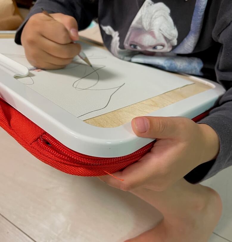 お絵かきセット一式を収納できるだけでなく、膝の上に乗せても机の上に乗せてもどちらでも作業がしやすいので、たとえば公園のベンチの上でもすぐにお絵かきに取りかかることが可能です。