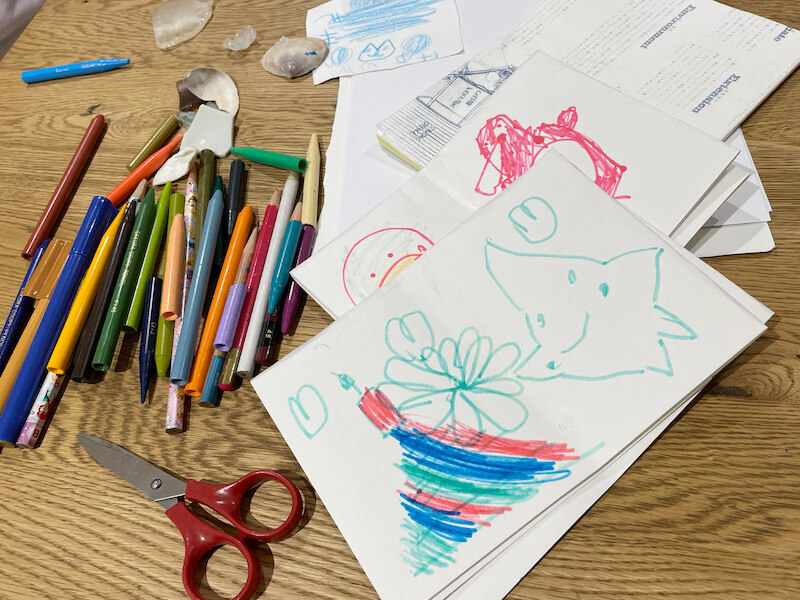 お絵かきが好きなのはいいけれど、気になっていたのがいつも家の床の上に転がっている色鉛筆やクーピーなどのお絵かき道具たち。