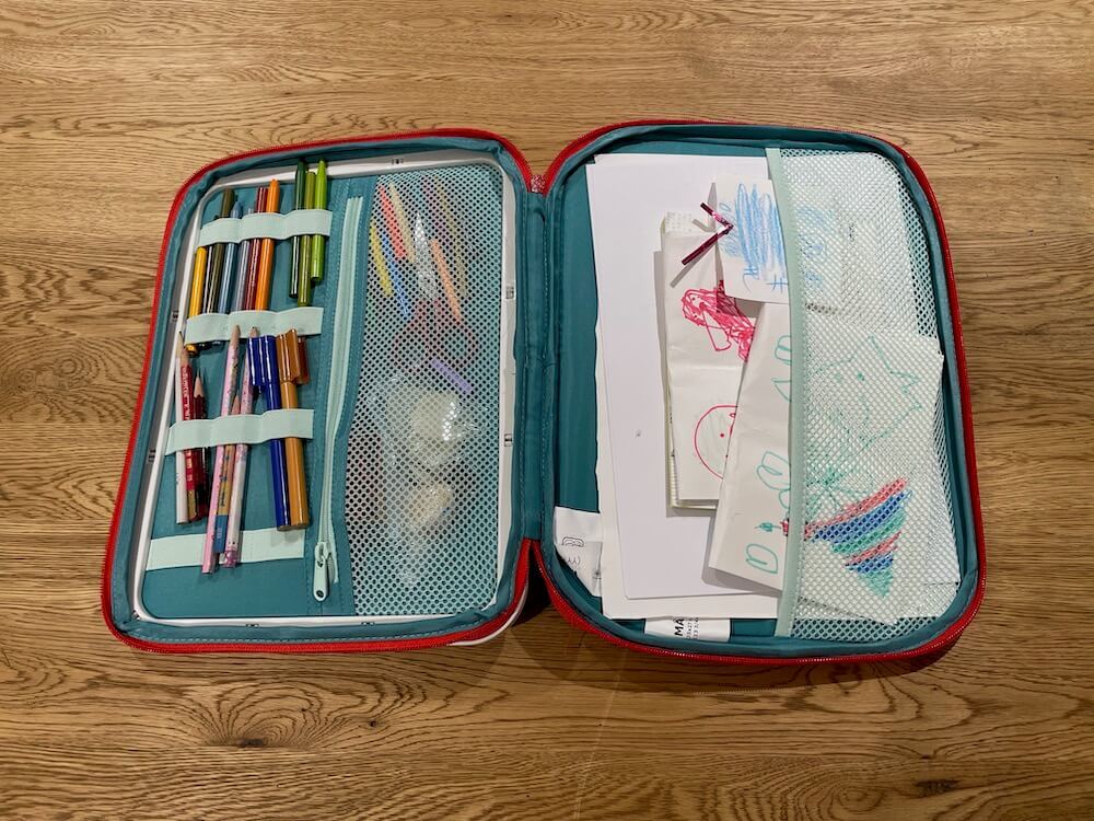 お絵かき大好きな娘はこちらのケースを見るなり、自身の色鉛筆や画用紙をたっぷり詰め込み、あっという間に「お絵かきセット」が完成!