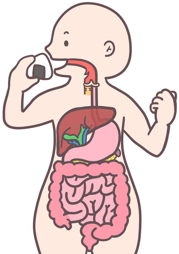 人の体には口からお尻の穴まで、空気や食べ物が通る1本道があり、食べたものは口→食道→胃→小腸→大腸と消化器官を進みます。その中で食べ物は分解され、食べ物に含まれる栄養素が血液に吸収されて、不要物がうんちやおしっことして排出されます。
