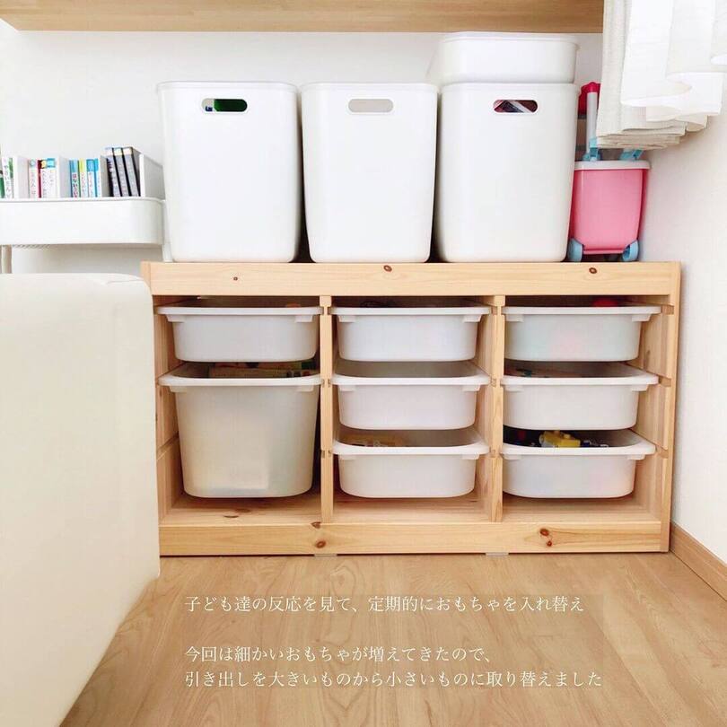 子育て家庭に人気のイケアの「トロファスト」にざっくり分類のポイポイ収納でお片づけも簡単。子どもたちの成長や好みに合わせて、収納を定期的に見直しているそう。