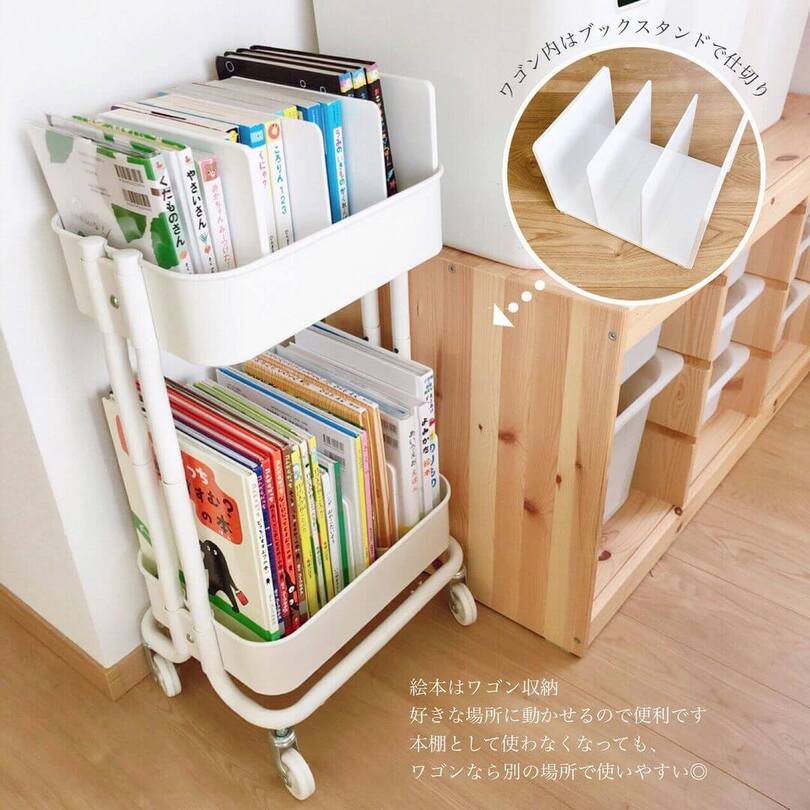 絵本は移動できるワゴン収納。読みたい場所に持っていけば、片づけながら次の絵本を取り出せます。ブックスタンドの仕切りがあるので、たくさん本を抜いても倒れず、取り出した本もすぐに戻せます。