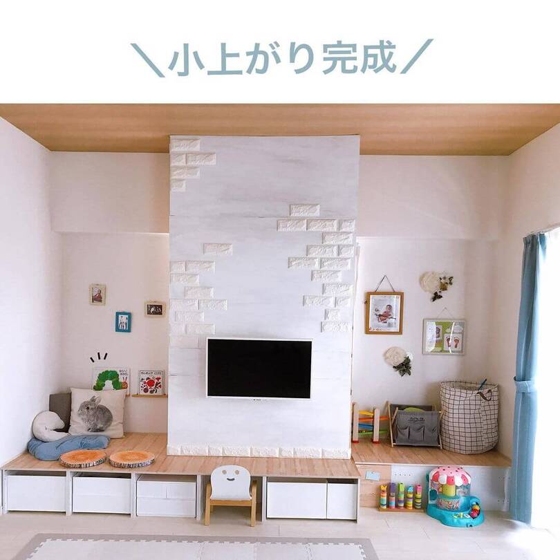 最後に紹介するmisakiさんは、カラーボックスを土台に小上がりを手作りして収納スペースを確保!テレビを掛けている壁も「ラブリコ」というDIYパーツとベニヤ板で作ったものだそう。