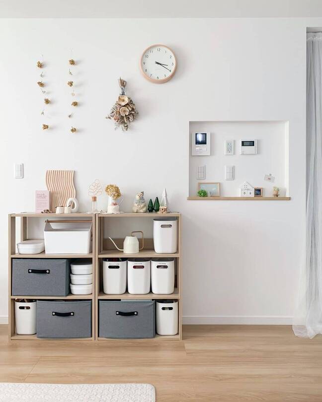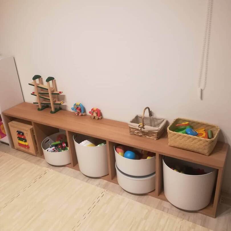 こちらは無印良品の「スタッキングシェルフ」に、大容量の「やわらかポリエチレンケース」を組み合わせたアイデア。子どもっぽすぎない高級感のあるシェルフが、リビングに落ち着いた印象を与えてくれます。四角い棚に丸いケースを合わせているところがおしゃれ。