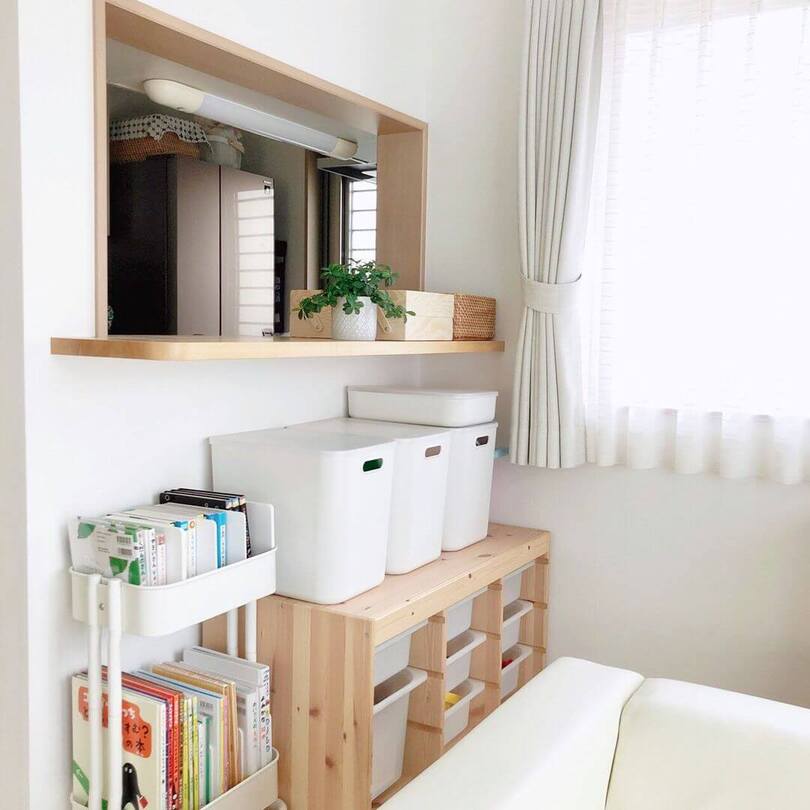 リビングに入ったときに目に入らない、キッチンカウンターの下におもちゃをまとめたfufu.さん。ソファにも隠れるし、収納家具をインテリアと同じ白木と白で統一しているのですっきりなじんで見えますね。