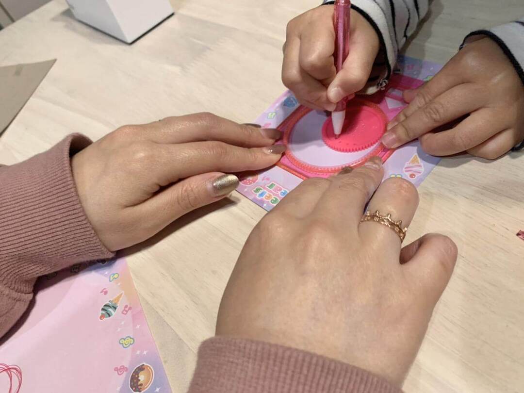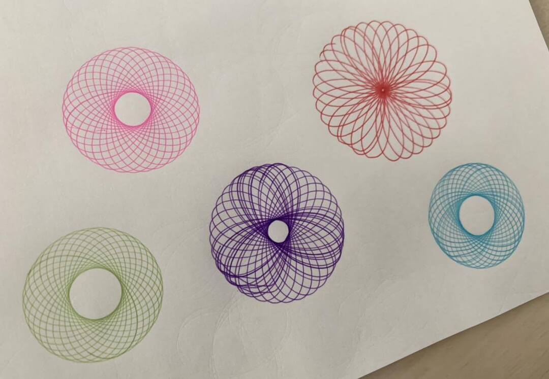 様々なモチーフがつくれる「くるくる定規セット」ですが、使い方がシンプルなわりに途中でギアから歯車が離れてしまったり、定規を固定する手がゆるんでズレてしまったりと、意外と難しい…。正直、大人でも難しいんです。