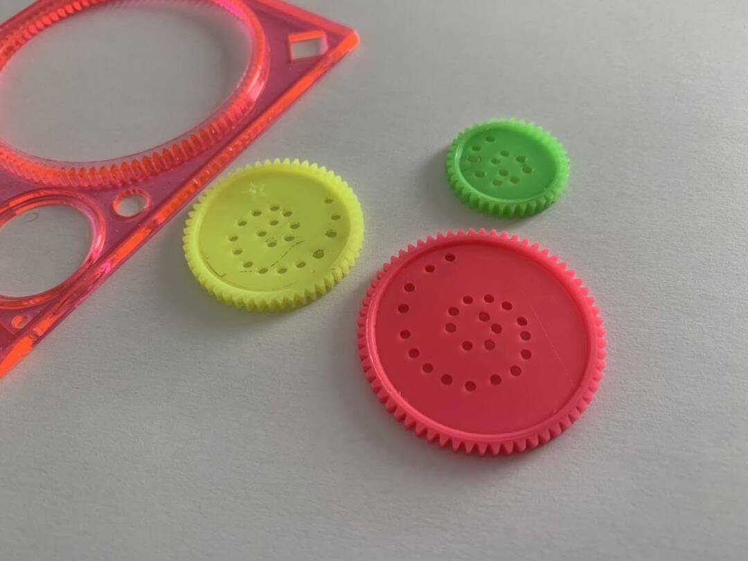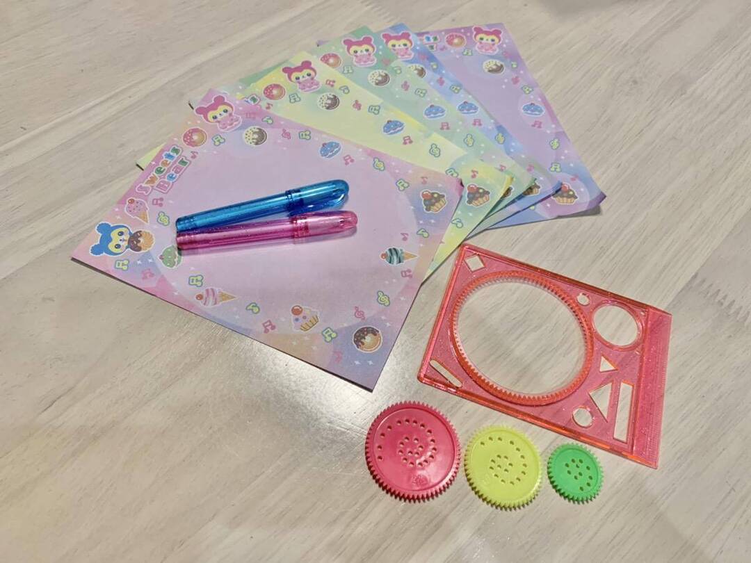歯車は大きさの異なるピンク・黄色・緑の3種類。どの歯車を使うかによって、全く違うデザインを描くことができますよ♡