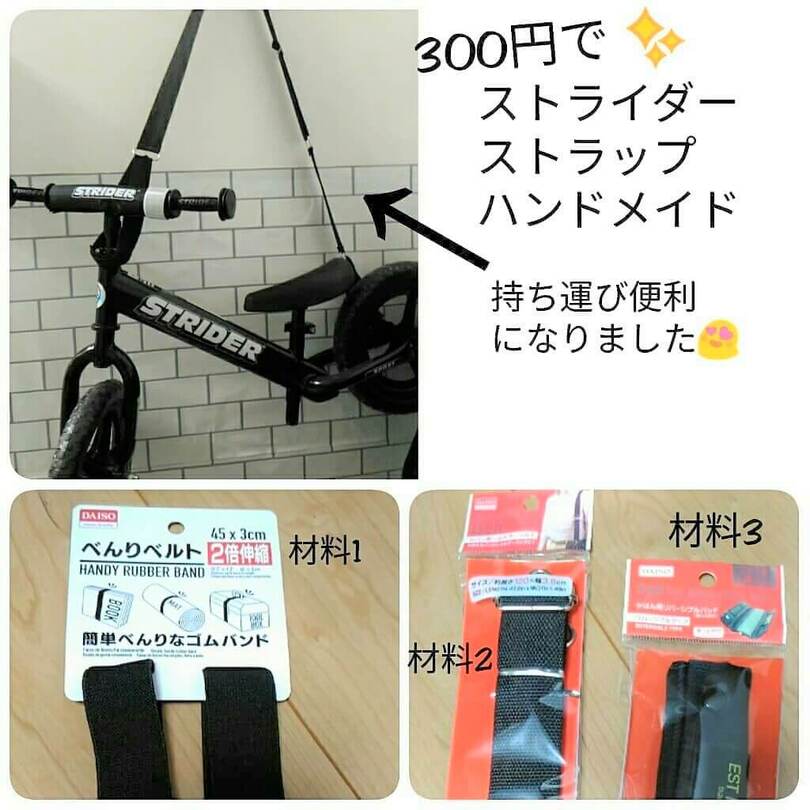 公道での運転は禁止されているストライダーは、持ち運ぶシーンも多いですよね。meeさんはダイソーのゴムバンドとショルダーベルトでストラップを手作り!