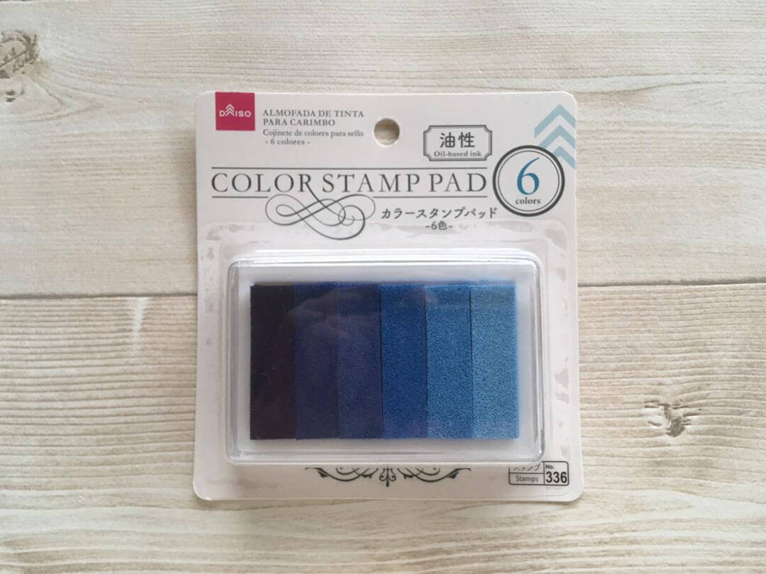 スタンプ台は同じくダイソーで見つけた、油性の「カラースタンプパッド」を使います。青のグラデーションがとてもきれい。好みの濃さを選べますよ♪