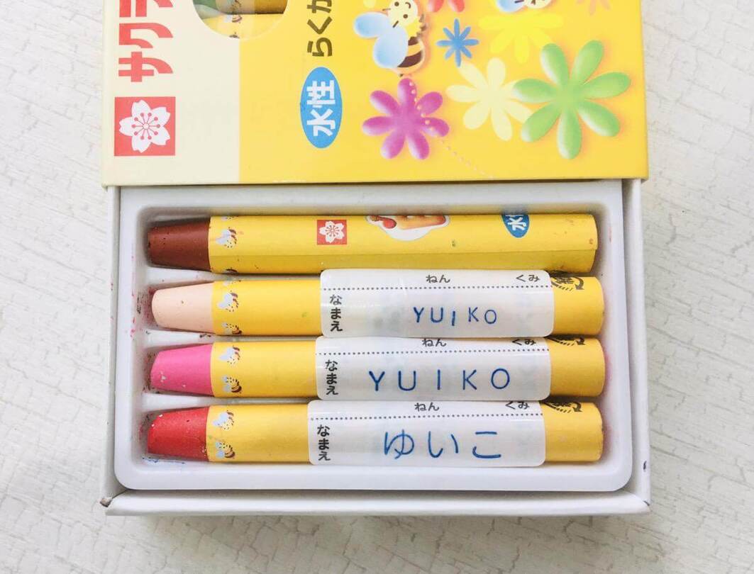 最後はクレヨンへの名前つけです。クレヨン1本1本に名前つけをするのは、本当に大変!シールに名前スタンプを押したものを貼れば、自分で1本ずつ記入するよりもきれいで簡単です。