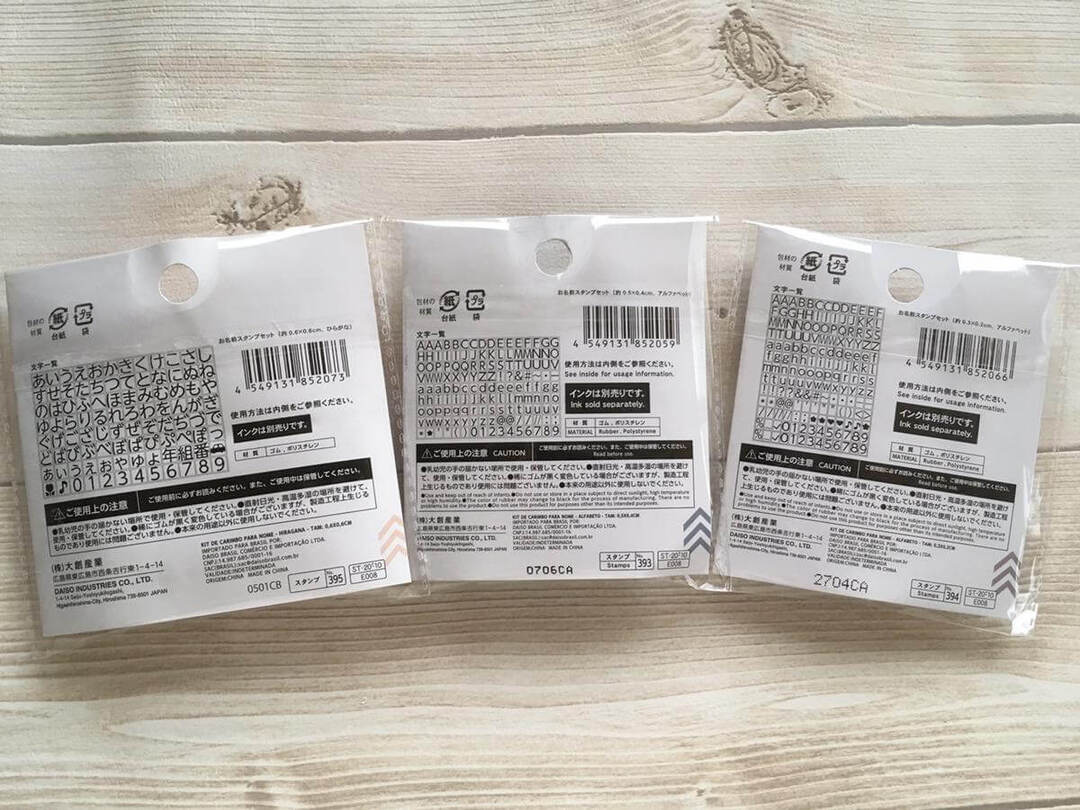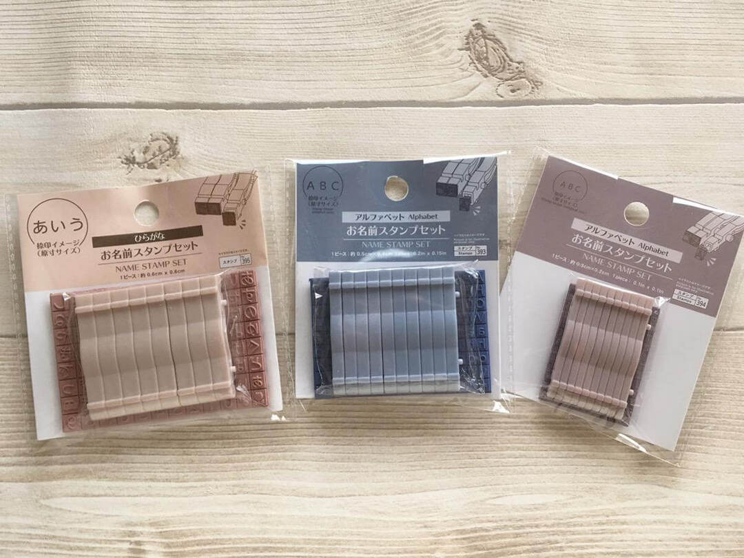 ダイソーの「お名前スタンプ」にはひらがなとアルファベットがあり、それぞれ大中小の3種類ずつ販売されています。今回は、大サイズのひらがなスタンプと、中と小サイズのアルファベットスタンプも購入!