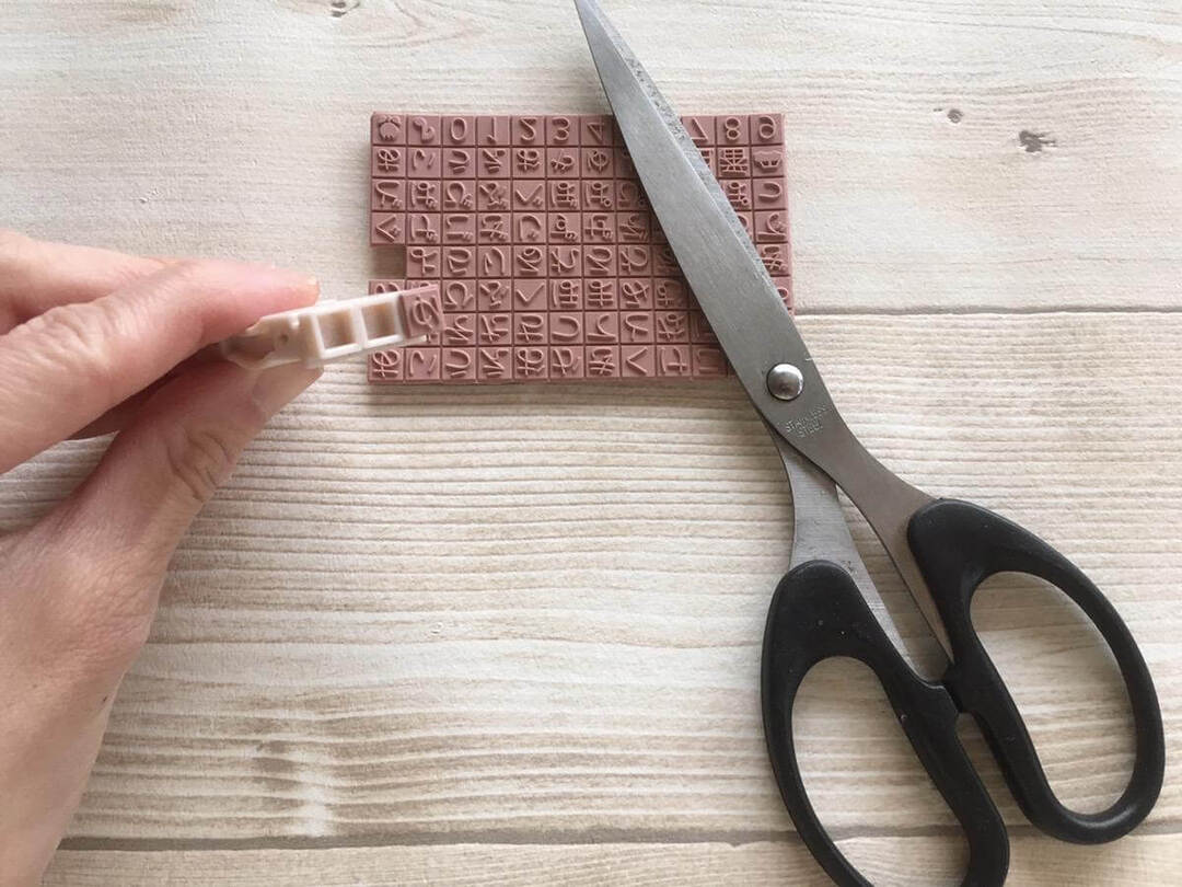 スタンプは該当する文字をチョキチョキ切り取るだけ。小さいハサミを使った方が切りやすいかもしれません。スタンプを連結ホルダーにはめ込んだら完成です!
