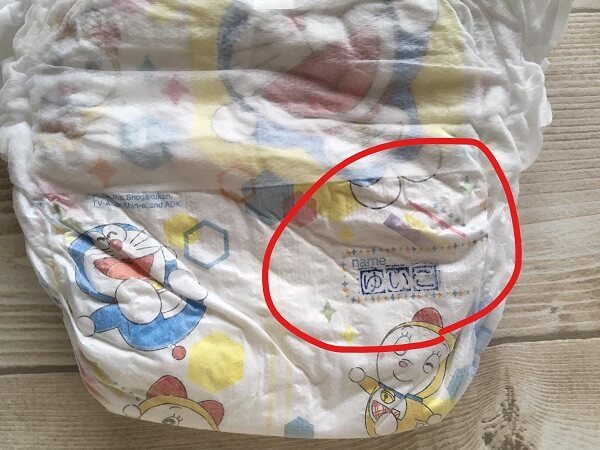 まずは、3歳の娘が保育園に持っていくためのオムツにポン!現在トイトレ中なので必要な数は減りましたが、油性マジックで書くと手間がかかります。