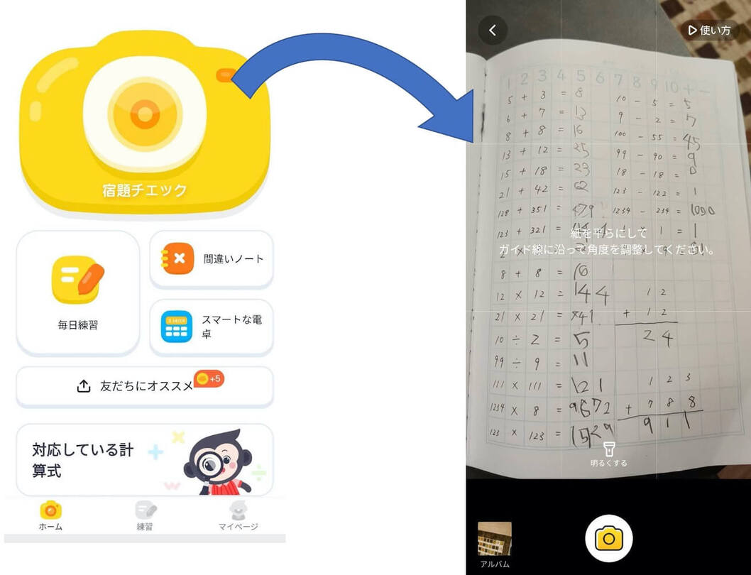 AI画像認識技術により、答案を撮影して1秒たらずで足し算や引き算、かけ算などの解答の正誤を見極めてくれます。