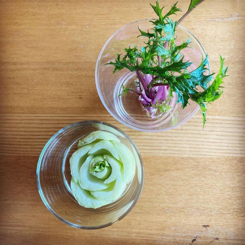 紫の茎の野菜は水菜なんだそう。「ミズナが並び始めると冬本番」と言われるほど、これからの時期においしくなる野菜です。もう一つはチンゲン菜です。 こんな風にコップに入れると、部屋の中のちょっとしたアクセントになったり、家族の会話のきっかけにもなりそうです♪