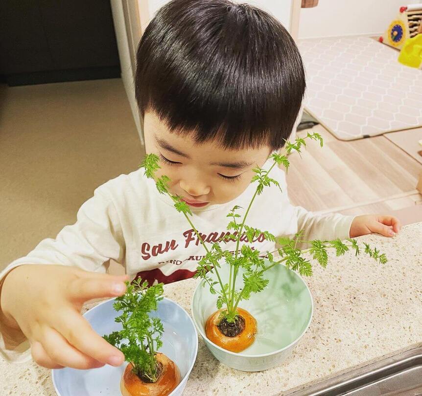 お子さんといっしょににんじんのリボベジを楽しんでいるりさこの暮らしとココロさん。リボベジのいいところはお金がかかってないゆえに、子どもがどんなにさわっても、こぼしても心穏やかに見守れるところなんだとか!