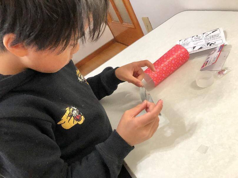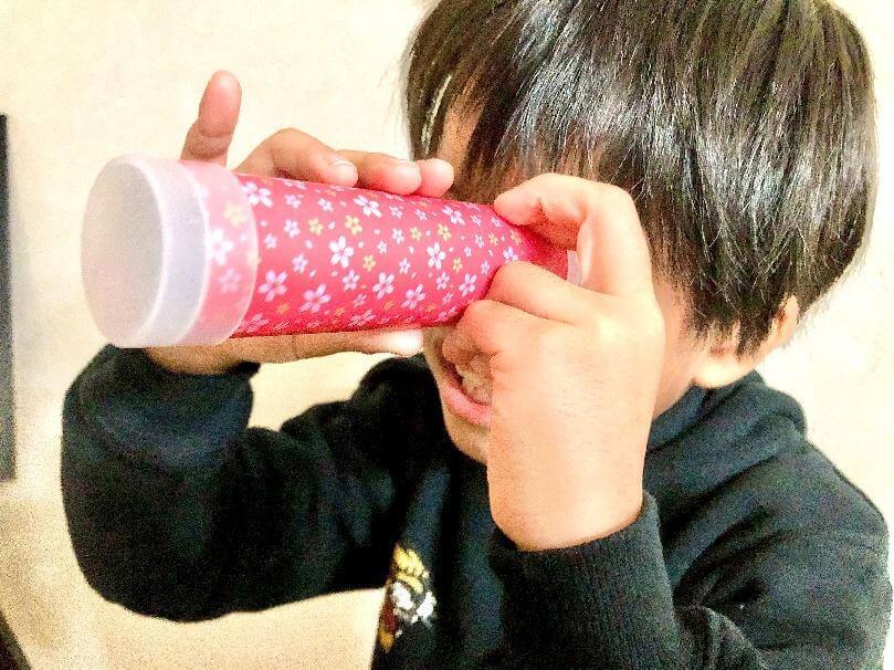 完成した万華鏡を早速のぞいてみた息子は「キレイ~☆」と大満足な様子。