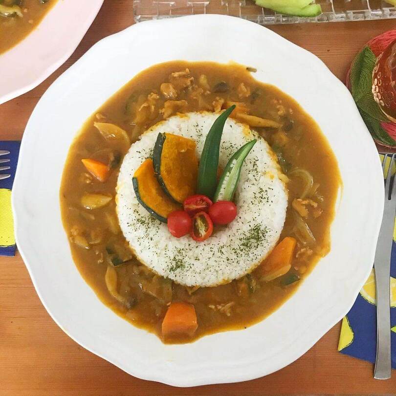 エンジェルプレートを使ってご飯を盛り付けて、カレーと野菜をトッピング♪ たったそれだけでいつもより凝った盛り付けになるので、普段使いにも役立ちますね。
