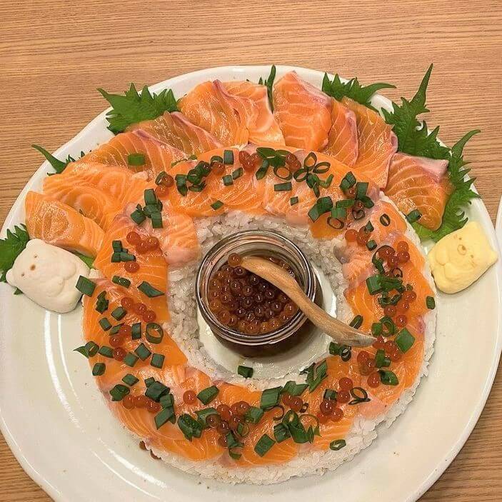 サーモンを敷き詰めた上に、ご飯をのせてひっくり返せば、サーモンといくらで親子寿司に!ほかにもお好みのお刺身を使って、簡単にリース型のお寿司に挑戦してみては?