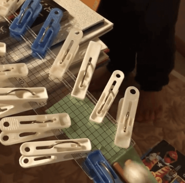 定規に無数の洗濯ばさみをはさんで作った、こちらのピタゴラ装置アイデア。