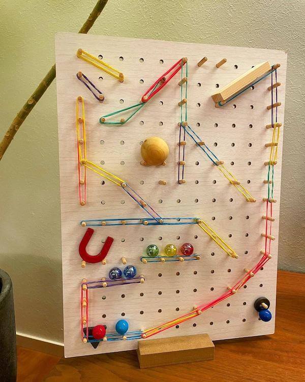 無数の穴が開いており、ダボと輪ゴムを組み合わせれば自由にピタゴラ装置が作れちゃいます♪