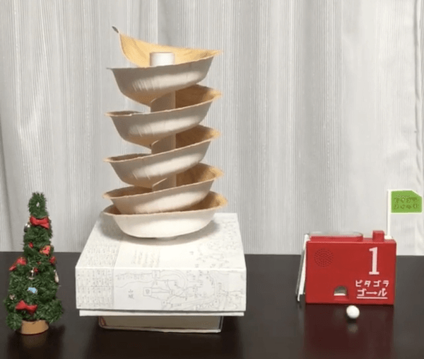 落ちてきたビー玉はNHKから販売されている「ピタゴラスイッチ ピタゴラゴール1号」の装置に入って旗があがると同時に、番組でお馴染み「ピタゴラスイッチ♪」のメロディーが流れます♪