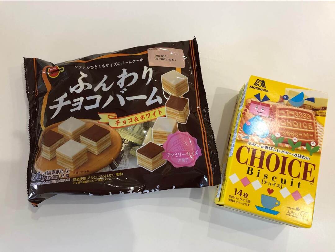 ダイソーのビスケットはサイズが小さめだったので、スーパーで王道のビスケット・森永の「CHOICE」と、ブロック型のブルボン「ふんわりチョコバーム」を買い足しました。