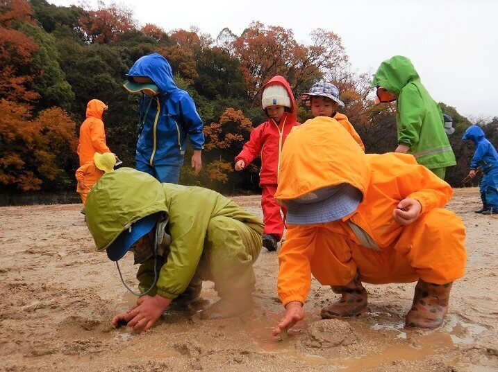 私たちの園では、冬の冷たい雨の日でもカッパを着て「遊びにいってきまーす!」と元気に飛び出していきます。砂を掘って水たまりの水を流したり、泥団子や泥のケーキを作ったりしています。