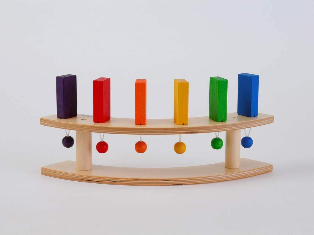 子どもが手のひらでつかめるサイズの、6色のカラフルなドミノ。端のひとつを倒すとパタパタと心地よい音を立てて倒れていきます。