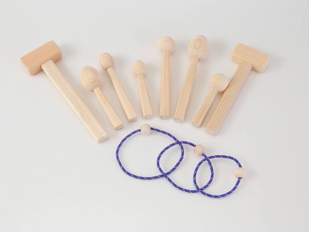 水面で浮き沈みする木玉を、木づちで叩いてもぐら叩きゲームのように遊ぶおもちゃ。木玉は3種類あり、それぞれ異なる動きをするので、つい集中して時間が経つのを忘れてしまいそう。木玉目がけて投げて遊ぶ"投げ輪"もついています。