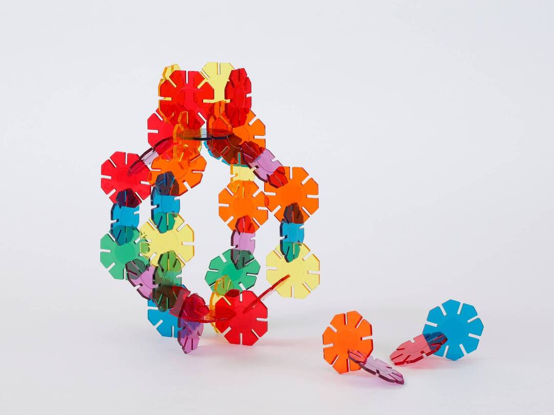 花びらのような形がかわいい八角形のブロック「オクトンズ」。ブロックの切り込み同士を組み合わせてつなげ、立体的な作品を作ることができます。