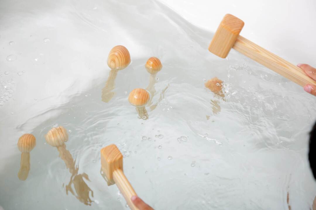 お風呂で遊べるおもちゃにはさまざまな種類がありますが、木製のおもちゃは珍しいもの。このおもちゃは水遊びに適したヒノキ、スギ、サワラを使用しています。