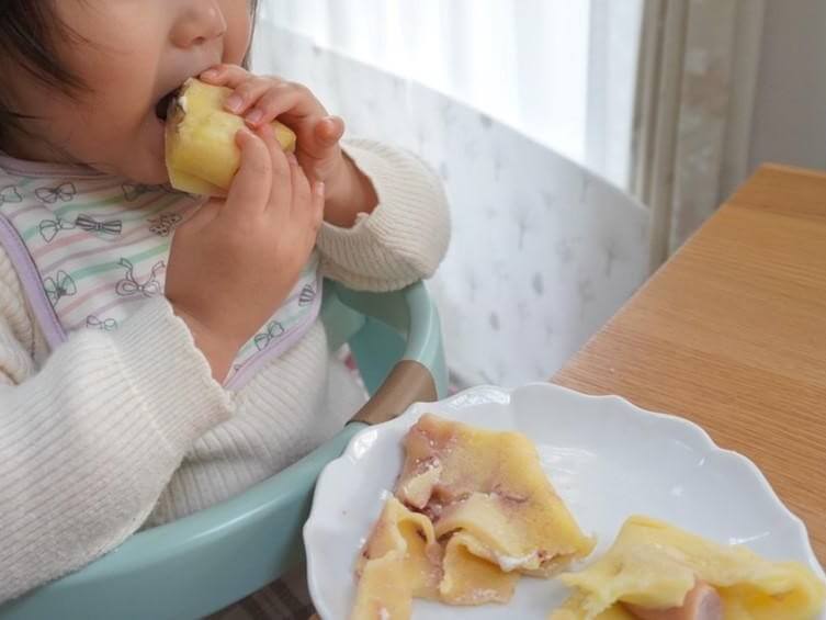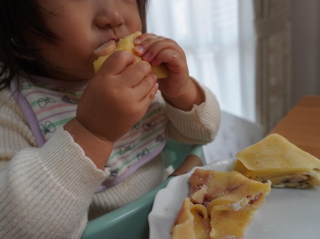 完成したブリトーを半分にカットして娘に食べさせると、はじめは見慣れないソーセージの断面に不思議そうな顔をしていたものの、ひとくち食べると「おいしい♡」とパクパク食べてくれました。