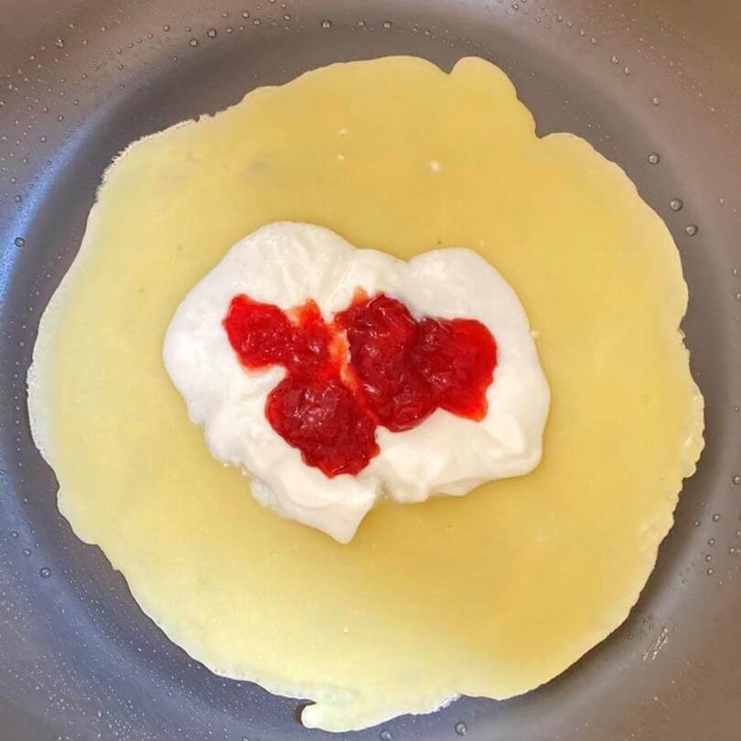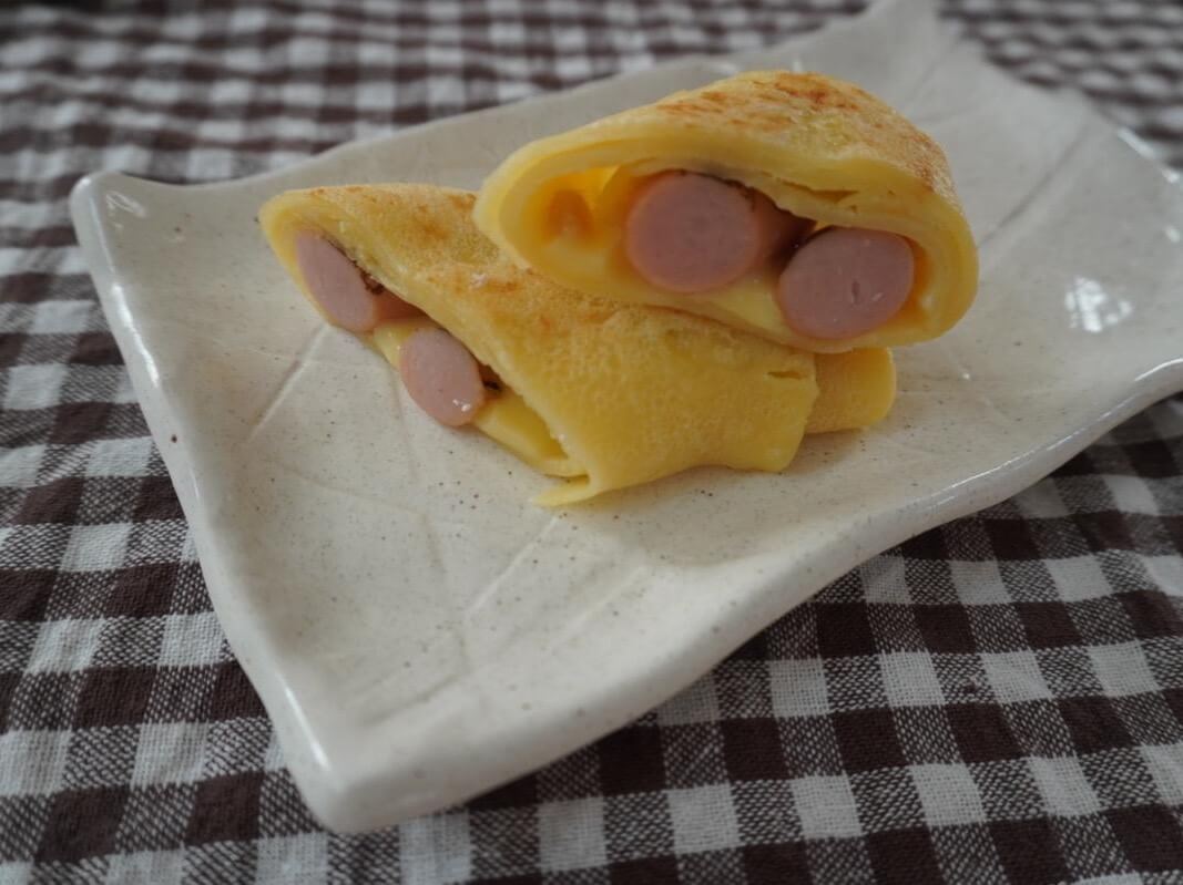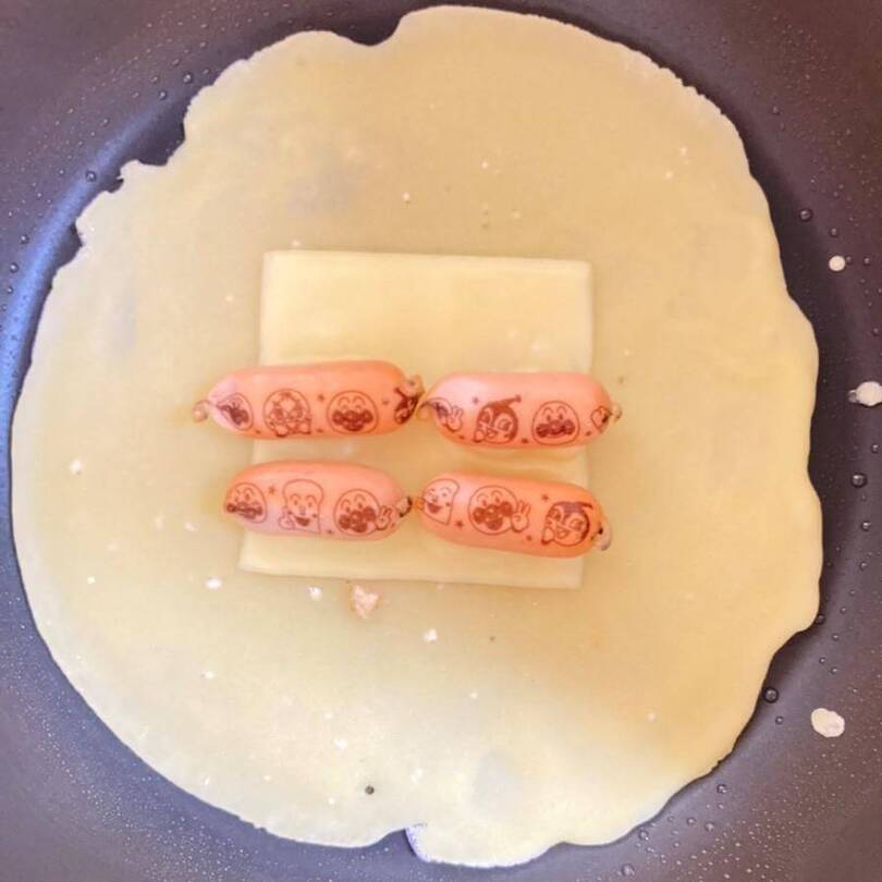 生地の上にチーズとソーセージをのせて加熱するだけで簡単に完成しました。フライパンの熱でチーズが程よくとろけて包みやすいです。